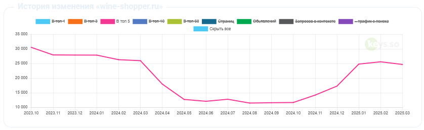 В марте 2025 года в топ-1 вышло по профильной алкогольной тематике 2079 запросов. И это в 3,2 раза больше (в сентябре 2024 года было 633 запроса). Мы видим ниже на графике явное проседание и заметный рост после работы, проведенной нашей командой.