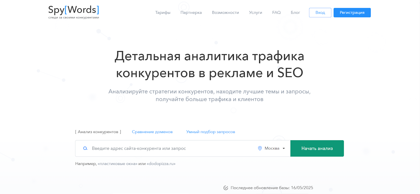 Аналитическая платформа для изучения конкурентов в контекстной рекламе и SEO. Сервис собирает и обрабатывает данные по ключевым словам, позициям сайтов в поисковой выдаче и параметрам рекламных кампаний конкурентов.