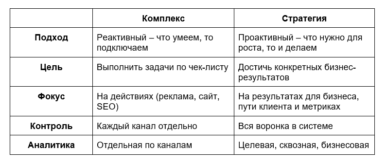 Как видно из таблицы, со стратегией приходит ясность. Маркетинг перестает быть «сборкой из кусочков». Он становится системой управления спросом, восприятием и доверием.