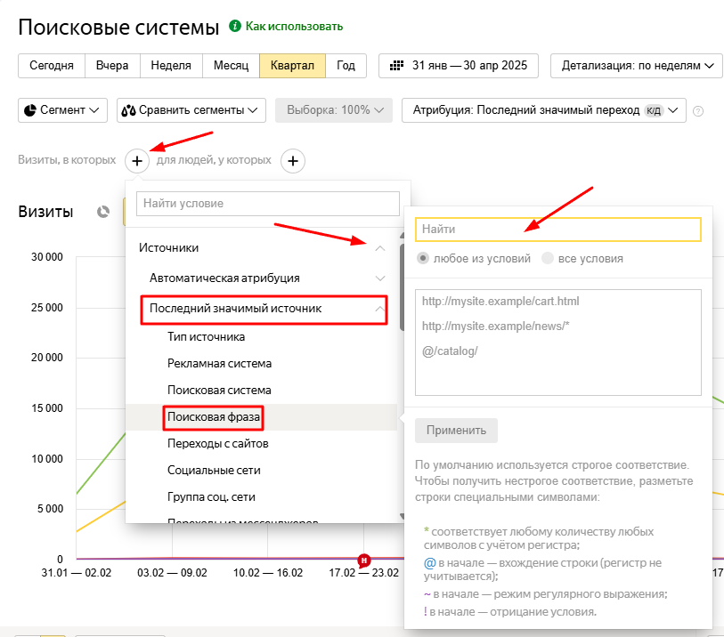 В параметрах визита нужно выбрать настройки «Последний значимый источник» → «Поисковая фраза» и ввести в специальное поле все возможные названия бренда, по которым пользователи могут его искать: