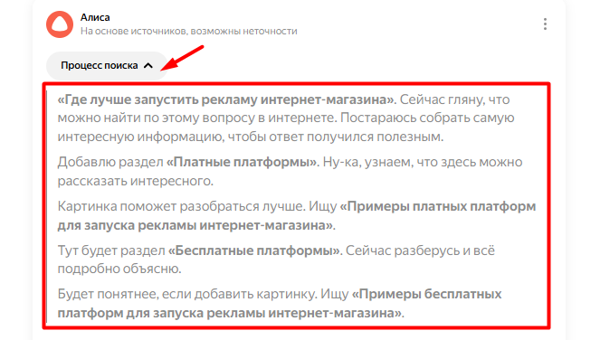 Вверху над рассуждениями есть опция «Как искали». Если на нее кликнуть, можно увидеть весь процесс сбора информации для рассуждения: