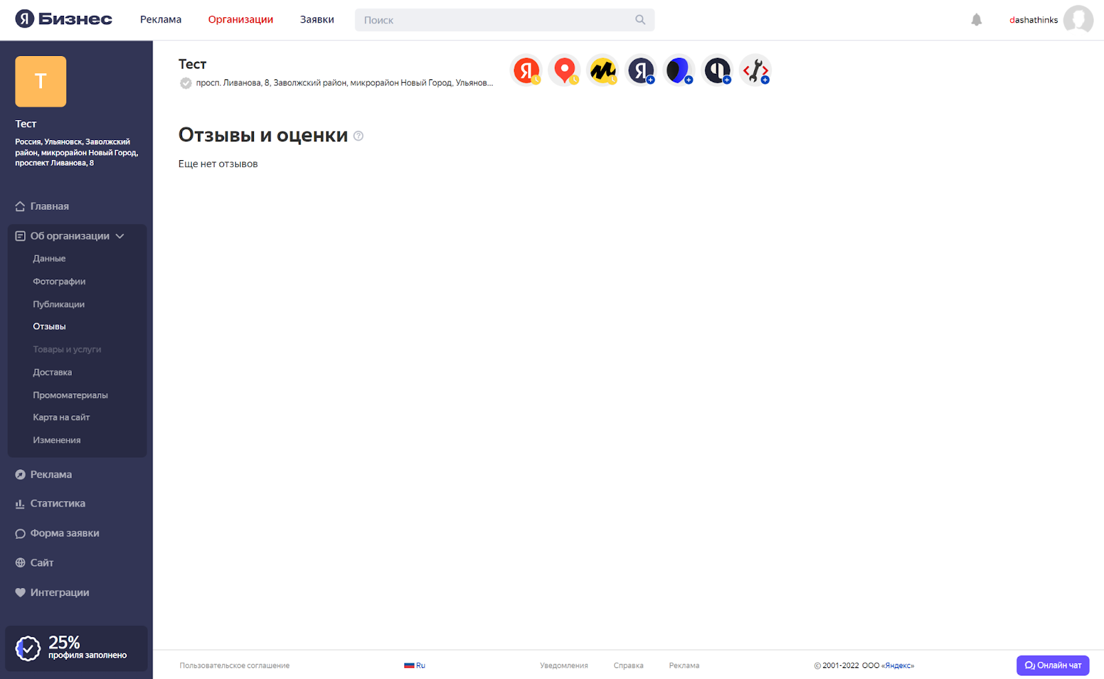 На панели слева содержится вся информация о бизнесе: фотографии, публикации, история изменений.