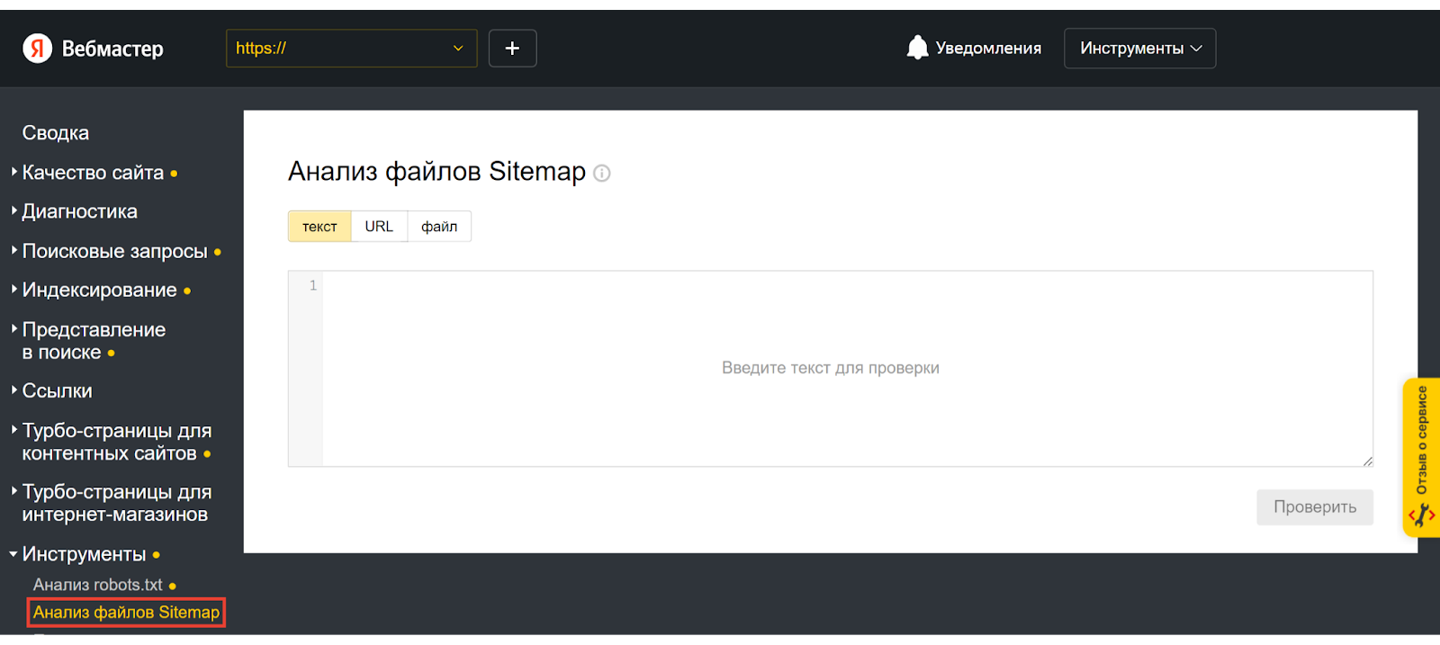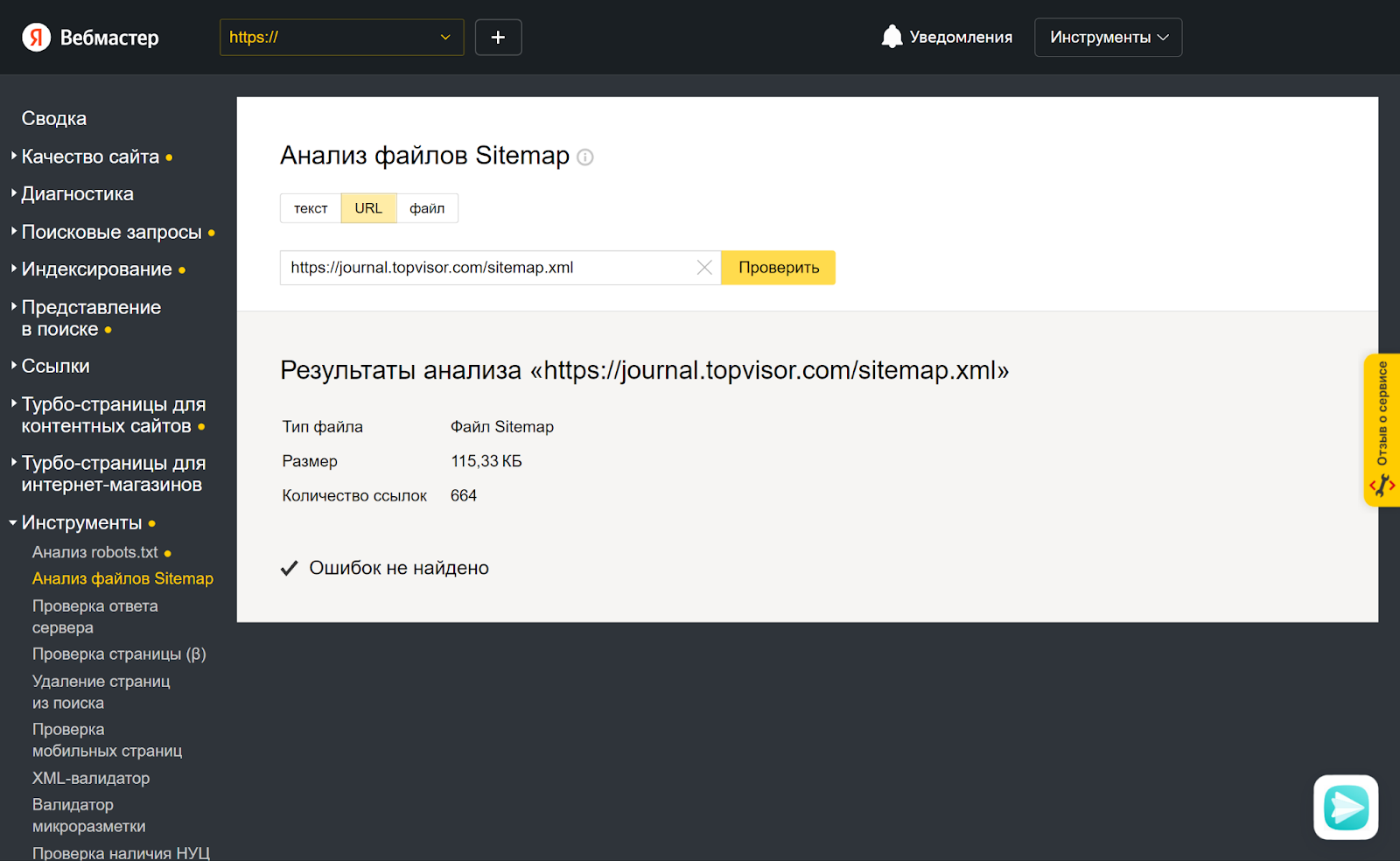 Если вы добавляете файл впервые, то перед этим его рекомендуется проверить на наличие ошибок. Делается это через вкладку «Инструменты» → «Анализ файлов Sitemap». Добавить сайт на проверку можно как в текстовом формате, так и в виде ссылки или с помощью загрузки файла sitemap.xml.