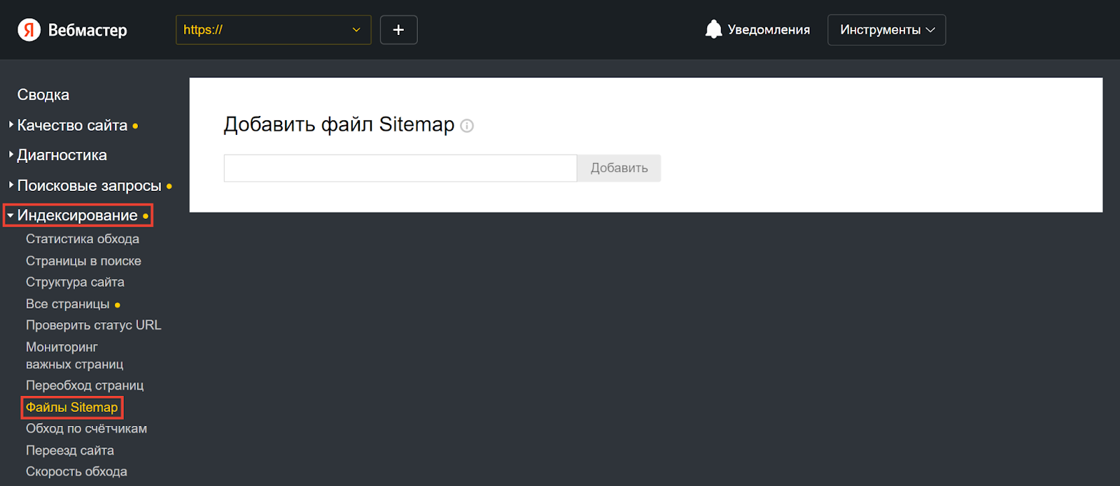 Чтобы отправить сайт на индексацию в Вебмастере, добавьте ссылку на Sitemap. Для этого перейдите во вкладку «Индексирование» → «Файлы Sitemap». В открывшееся окно вставьте ссылку на файл с вашего сайта и нажмите кнопку «Добавить».