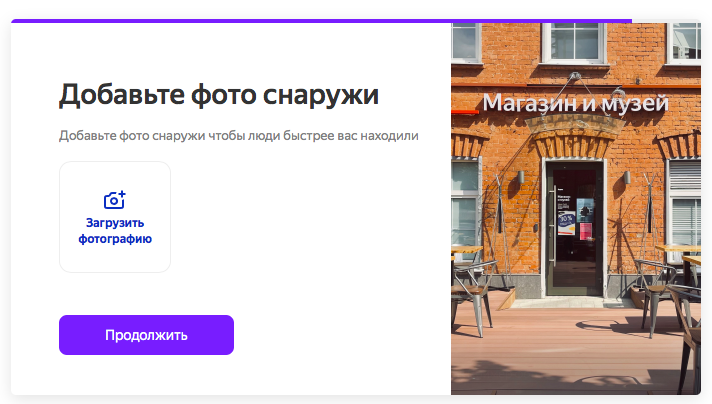 Следующим шагом нужно добавить фотографии организации снаружи. С их помощью клиентам будет проще вас найти. Если компания находится в торговом центре, то лучше добавить фотографии и фасада ТЦ, и входа в сам офис или магазин.
