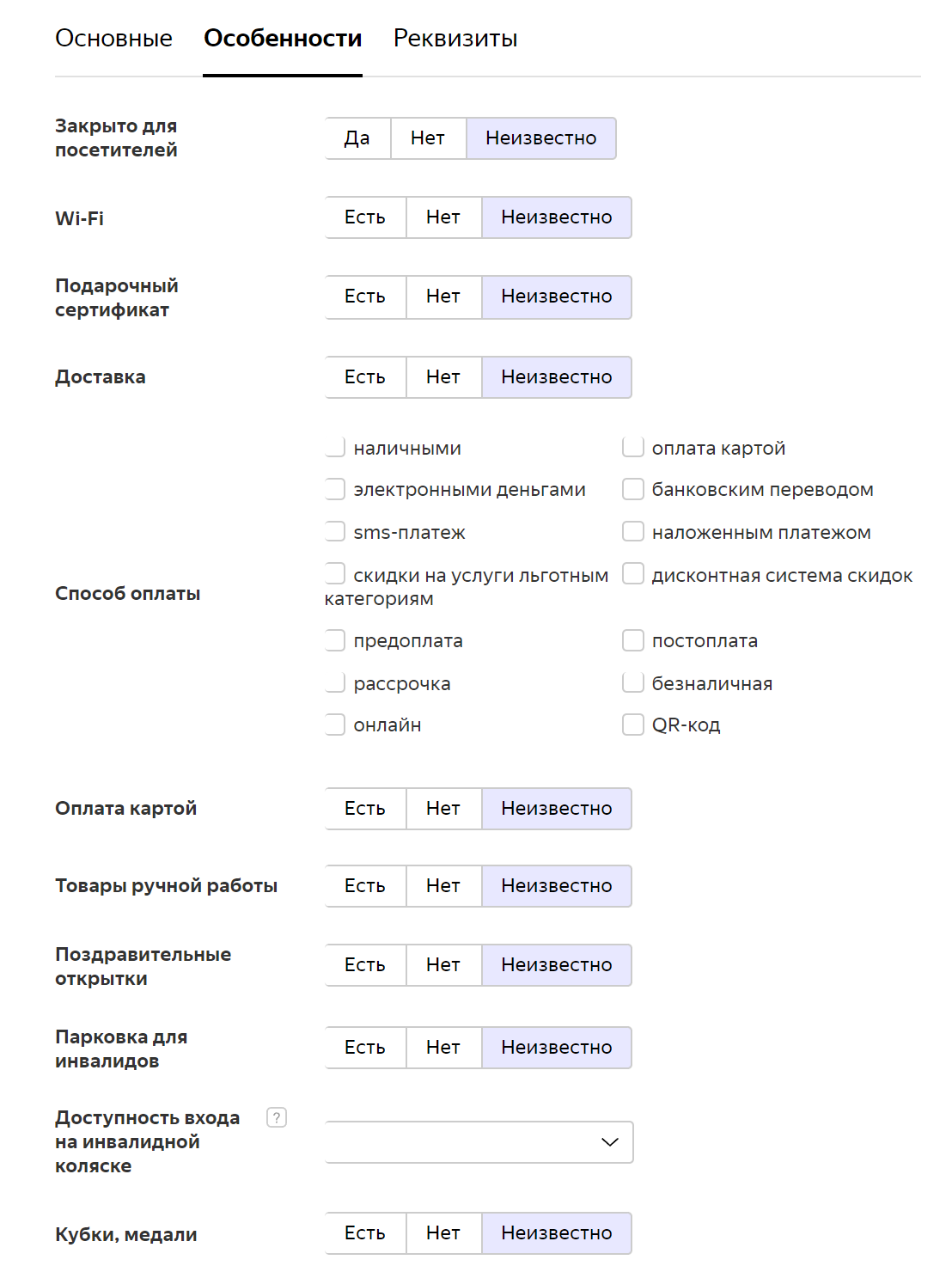 Также нужно описать особенности бизнеса: есть ли Wi-Fi, какими способами можно оплатить товар. Вся эта информация находится во вкладке «Особенности»: