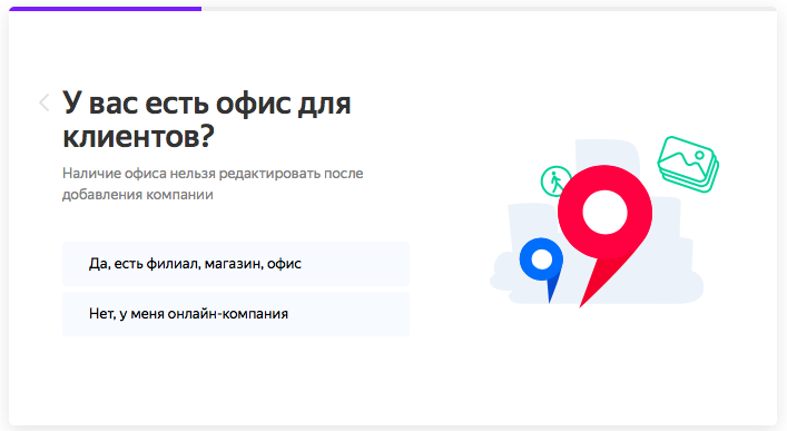 Далее необходимо указать, есть ли у вас физический офис или вы работаете только в онлайне. Если офис есть, но вы не принимаете в нем клиентов, адрес все равно можно указать – люди смогут находить компанию в результатах поиска на Яндекс Картах. В описании можно указать, что в офисе компания клиентов не принимает.