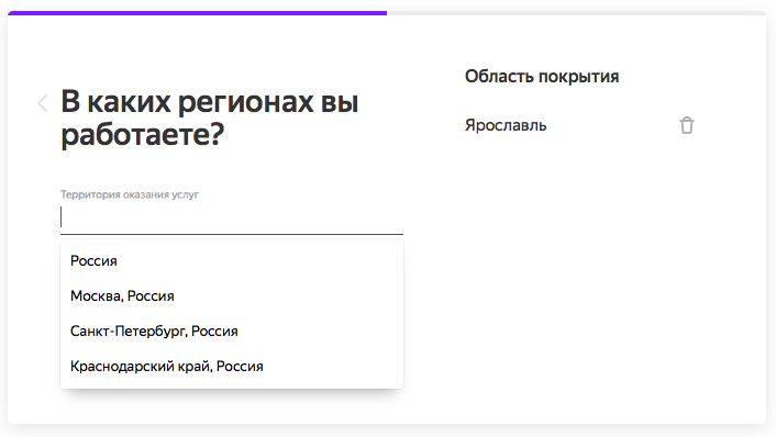 Если вы выбрали пункт «Нет, у меня онлайн-компания», то укажите, в каких регионах вы работаете. Это может положительно сказаться на поисковом продвижении сайта. Например, если у вас интернет-магазин, доставляющий товары только по Ярославлю, то когда пользователь будет искать товары с доставкой в этом регионе, ваша компания может получить приоритет в результатах выдачи.