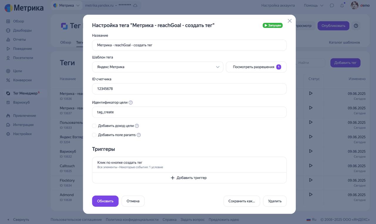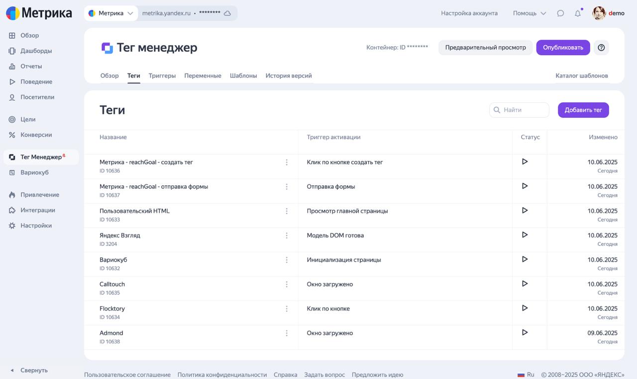 Пользователи смогут управлять тегами на сайте прямо из интерфейса Метрики: устанавливать новые скрипты, вносить изменения в существующие, настраивать события и цели для аналитики или рекламы.