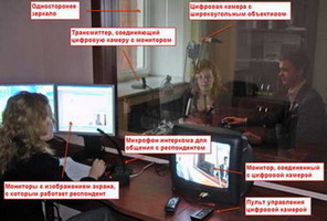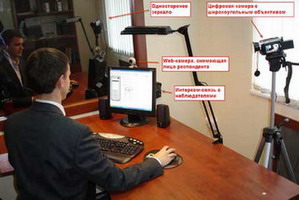 Модератор и респондент находятся в разных помещениях, разделенных односторонним зеркалом («зеркало Гизелла»). Это позволяет модератору и другим наблюдателям видеть действия респондента. Процесс usability-тестирования записывается камерами, одна из которых расположена на мониторе респондента, отслеживая мимику, движение глаз и т.д. Другая – на некотором расстоянии – снимает общее поведение респондента. Изображение транслируется на монитор, расположенный в комнате модератора. Общаться помогают различные средства связи (в данном случае микрофоны).